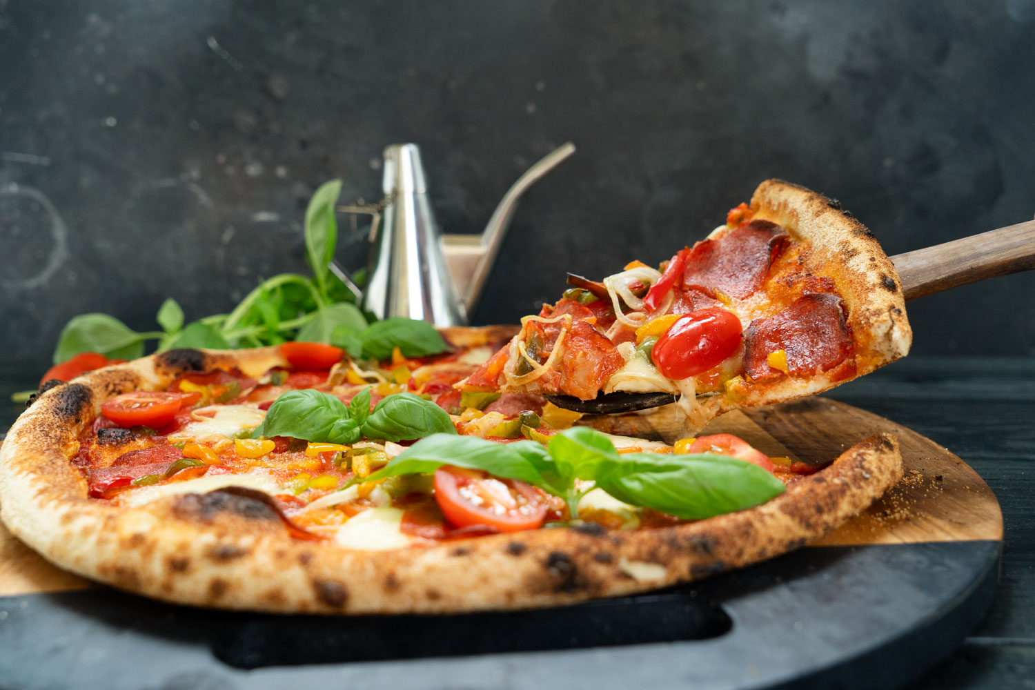 Per prima cosa, accendete il forno per pizza Heyran e impostatelo a 200 gradi Celsius per riscaldarlo. Dividete l’impasto lievitato in tre parti. Disponete una parte dell’impasto su una teglia unta con olio d’oliva.