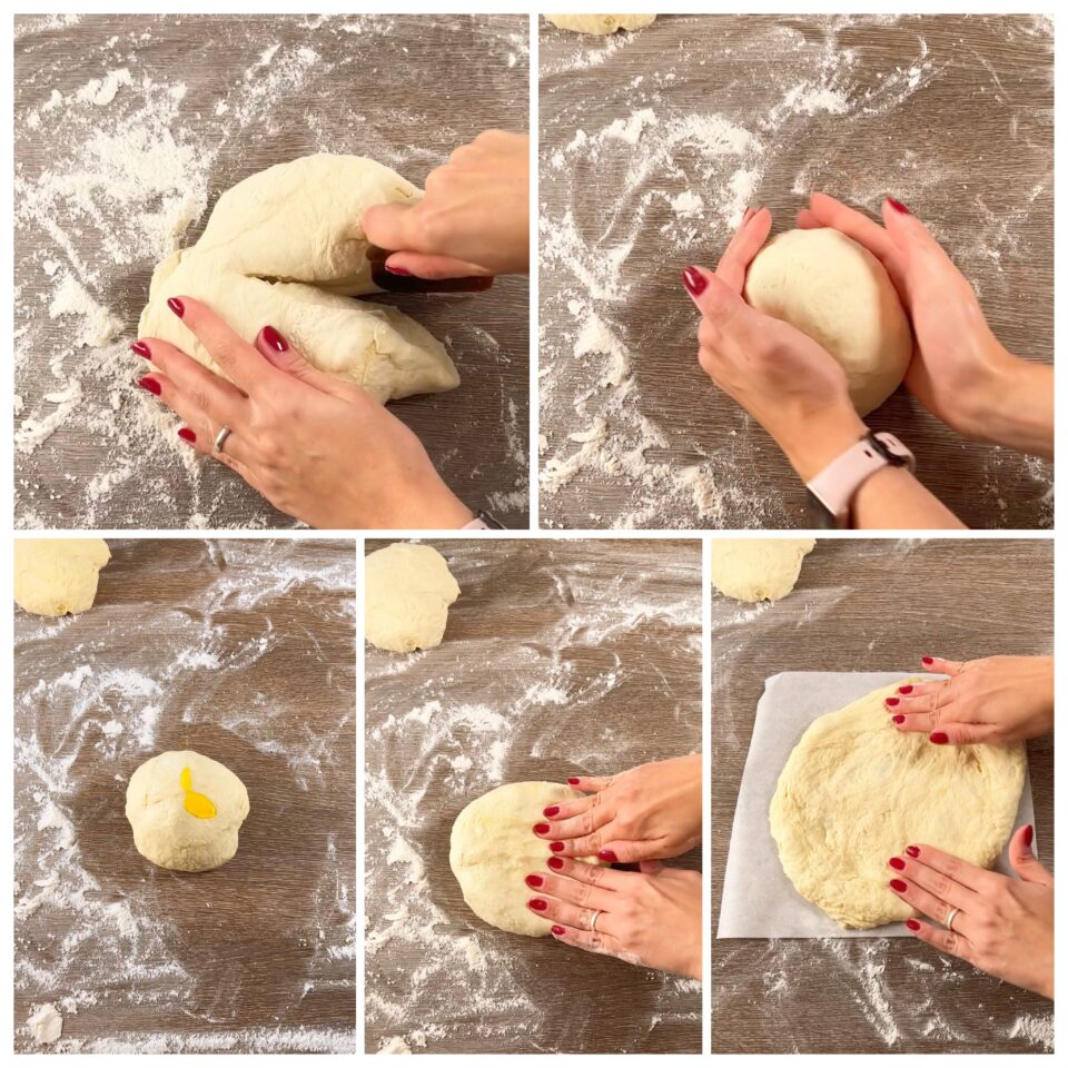 • Ora possiamo riprendere l’impasto. Lo portiamo sulla spianatoia infarinata e dividiamo l’impasto formando 3 palline. Le stendiamo con un filo d’olio utilizzando le dita e passando la pasta da una mano all’altra per allargarla.
