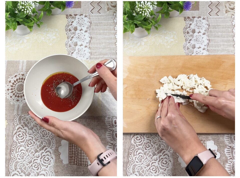 Prepariamo anche il condimento. Tamponiamo una mozzarella con carta assorbente da cucina e la tagliamo a cubetti. A parte prepariamo la salsa di pomodoro mescolando in una ciotola la passata, un filo d’olio, un pizzico di sale origano.