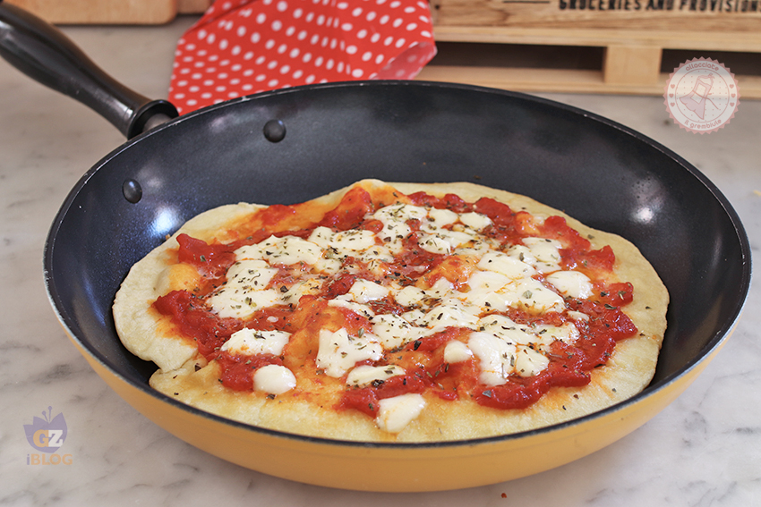 Spennellate la padella con poco olio e quando risulterà rovente trasferite la pizza all’interno. Condite a vostro gusto, l’importante è cospargere di condimento anche i bordi della pizza a contatto con la padella.