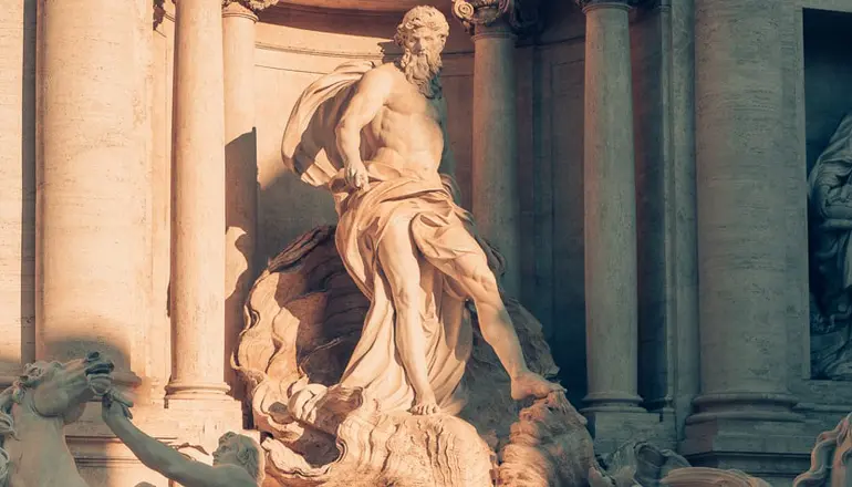 La prima statua che si vede è quella che si erge trionfante sotto un arco. Molti pensano che si tratti di Nettuno, ma è un Titano e il dio greco degli oceani. Un dio che guida un carro a forma di conchiglia trainato da due cavalli – uno selvaggio e uno mansueto – e governa le maree dei mari.