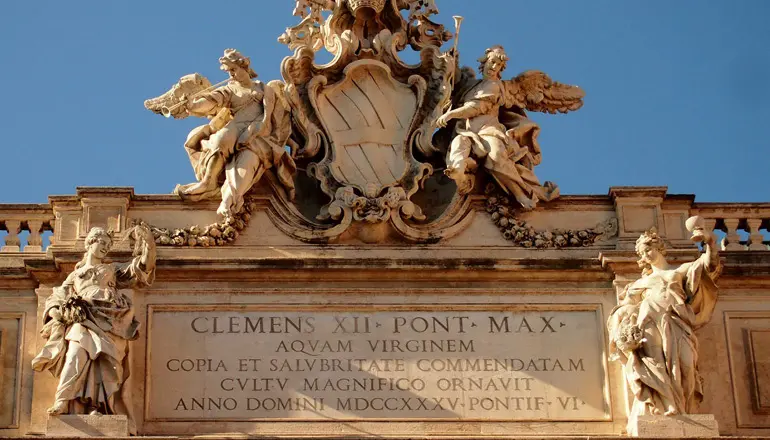 CLEMENS XII PON MAX AQVAM VIRGINEM COPIA ET SALVBRITATE COMMENDATAM CVLTV MAGNIFICO ORNAVIT ANNO DOMINI MDCCXXXV PONTIF VI