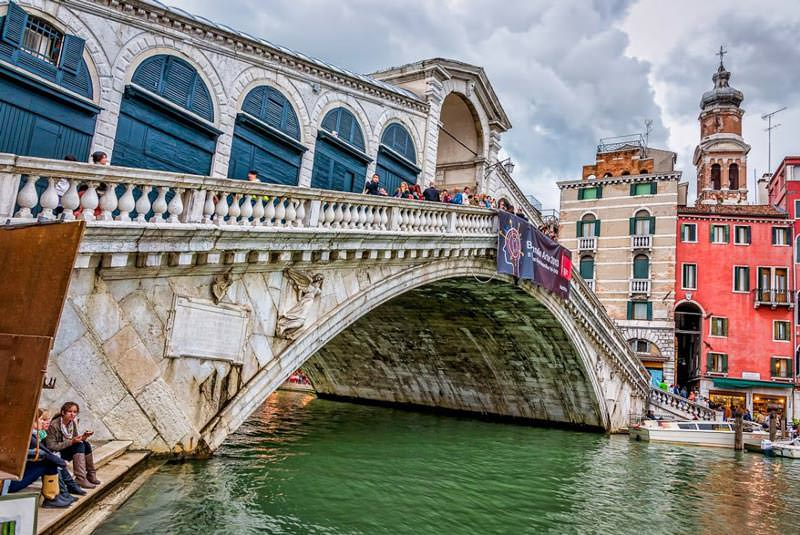 Uno dei monumenti più famosi di Venezia è il Ponte di Rialto, costruito alla fine del XVI secolo sul tratto più stretto del Canal Grande. Questo ponte, il più antico e famoso dei quattro che attraversano il Canal Grande, è un capolavoro architettonico in quanto ponte ad arco in pietra. Il Ponte di Rialto è lungo 48 metri e largo 23 metri, e ha tre passerelle, con negozi locali che vendono cibo, souvenir e bigiotteria al centro.